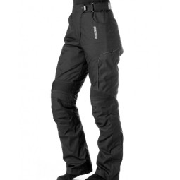 Pantalón de mujer fabricado en Nylon. Modelo de cuatro estaciones con forro térmico y membrana impermeable desmontables, ideal para utilizar todo el año. El patrón de este modelo no queda muy ajustado, sienta muy bien, ajustable a tu cintura mediante cinturón de velcro, podrás encontrar en él dos bolsillos laterales con un pequeño bordado de color negro sobre el bolsillo derecho; el modelo Venus va equipado con tomas de aire laterales, flexores sobre las rodillas y la zona lumbar para que sea más cómodo y flexible, por supuesto lleva reflectante para la visión nocturna y como no, sus correspondientes protecciones en caderas y rodillas que podrás extraer mediante bolsillos con cierre de velcro, para finalizar comentarte que en los camales el cierre es mediante cremallera y correa de ajuste con velcro.